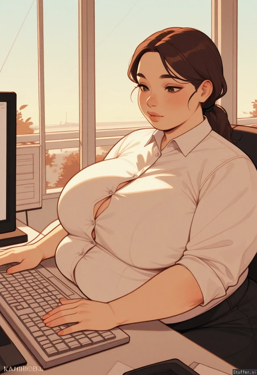 Highly detailed, morning, warm colors, KAMII MOMORU (artist), sitting, morning, office, working, pc, working on pc, keyboard Japanese girl, asian, medium hair, brown hair, black skirt, white buttoned tight shirt, tied hair, low ponytail (Morbidly obese:1.28), bursting buttons
