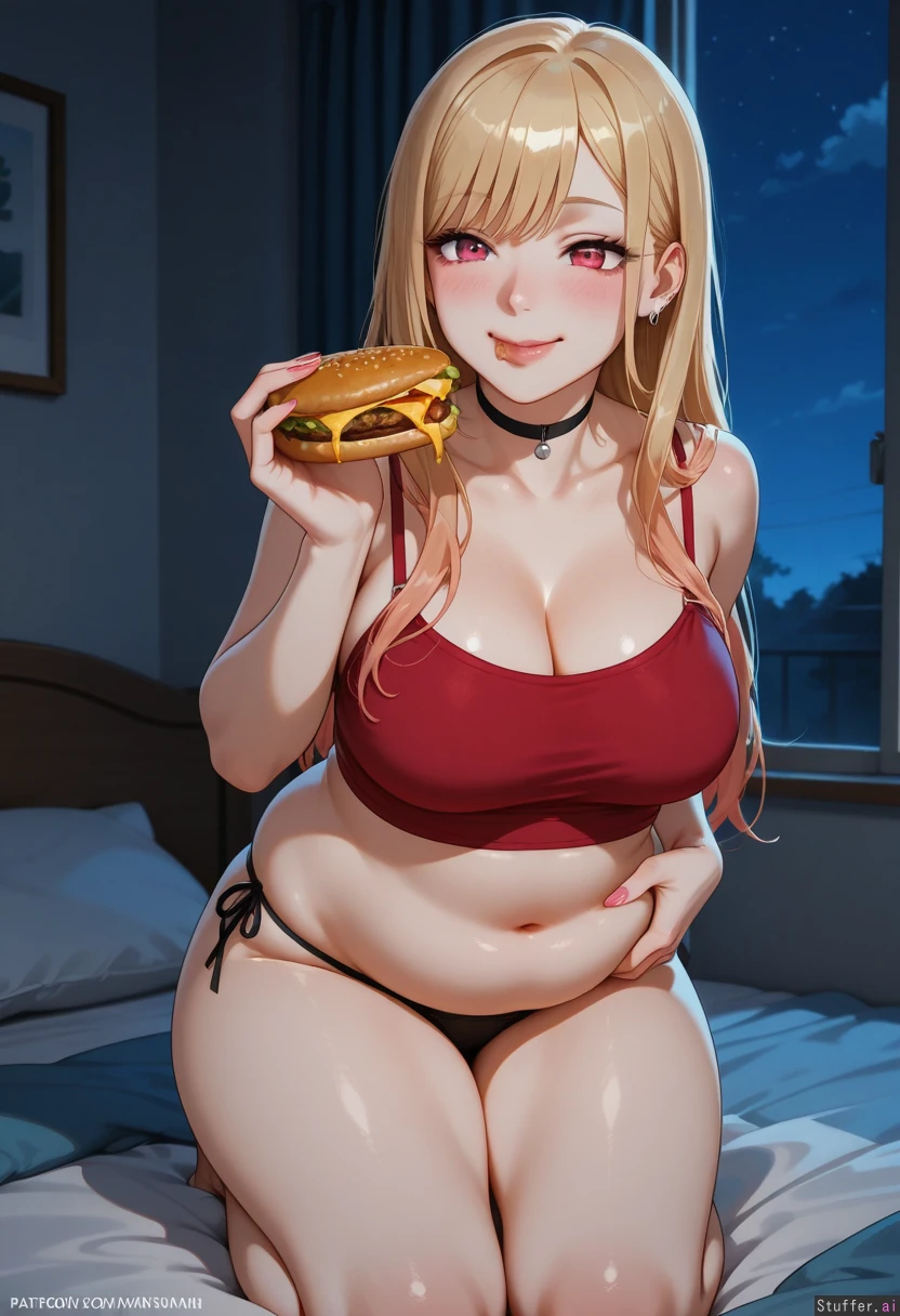 Realistic, vibrant colors, detailed style, night, Fancy Bedroom, dark, 1girl, Marin Kitagawa, smile, red crop top, midriff, solo, wide_hips, wide_thighs, fat_thighs, belly_button, curvaceous, spaghetti_strap, bedroom_eyes, black_panties, Cheeseburger, feeding, licking_own_lips Kneeling, leaning forward, pinching belly (chubby belly: 1.2)