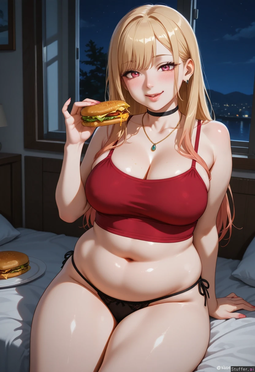 Realistic, vibrant colors, detailed style, night, Fancy Bedroom, dark, 1girl, Marin Kitagawa, smile, red crop top, midriff, solo, wide_hips, wide_thighs, fat_thighs, belly_button, curvaceous, spaghetti_strap, bedroom_eyes, black_panties, Cheeseburger, feeding, licking_own_lips Sitting, cheeseburger in each hand (chubby belly: 1.2)