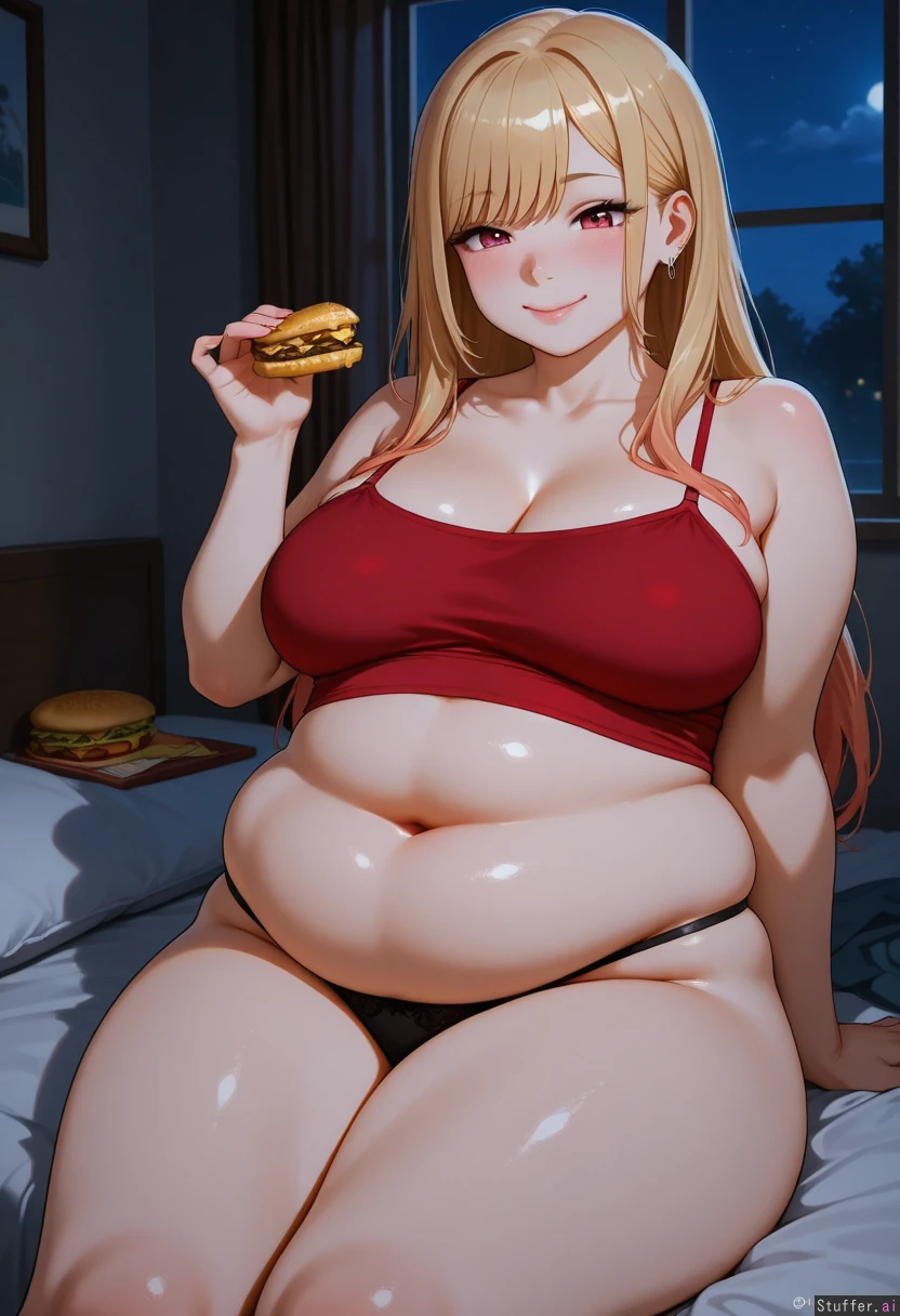 Realistic, vibrant colors, detailed style, night, Fancy Bedroom, dark, 1girl, Marin Kitagawa, smile, red crop top, midriff, solo, wide_hips, wide_thighs, fat_thighs, belly_button, curvaceous, spaghetti_strap, bedroom_eyes, black_panties, Cheeseburger, feeding, Lounging (chubby belly: 1.4)