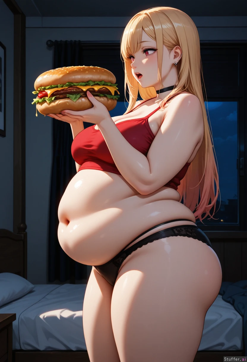 Realistic, vibrant colors, detailed style, night, Fancy Bedroom, dark, 1girl, Marin Kitagawa, red crop top, midriff, solo, wide_hips, wide_thighs, fat_thighs, belly_button, curvaceous, spaghetti_strap, bedroom_eyes, black_panties, Huge Cheeseburger, Side view, open mouth (chubby belly: 1.4)