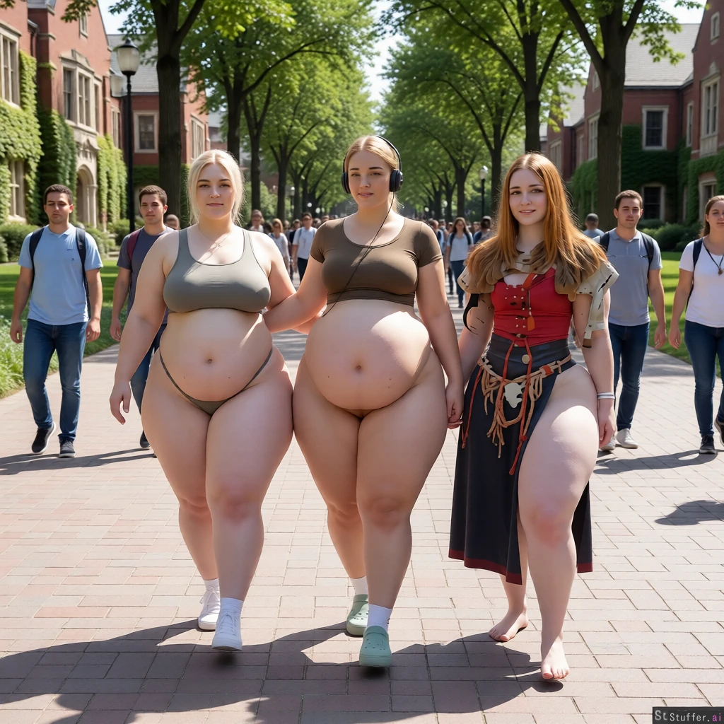 High quality, masterpiece, realistic lighting, high detail, really pretty faces, extremely fatter and fatter, they jiggle a bit, they swiftly walks by on a busy campus, keep her entire body in frame, extreme saddlebag hips, full body view, camera pulls away, huge belly getting bigger