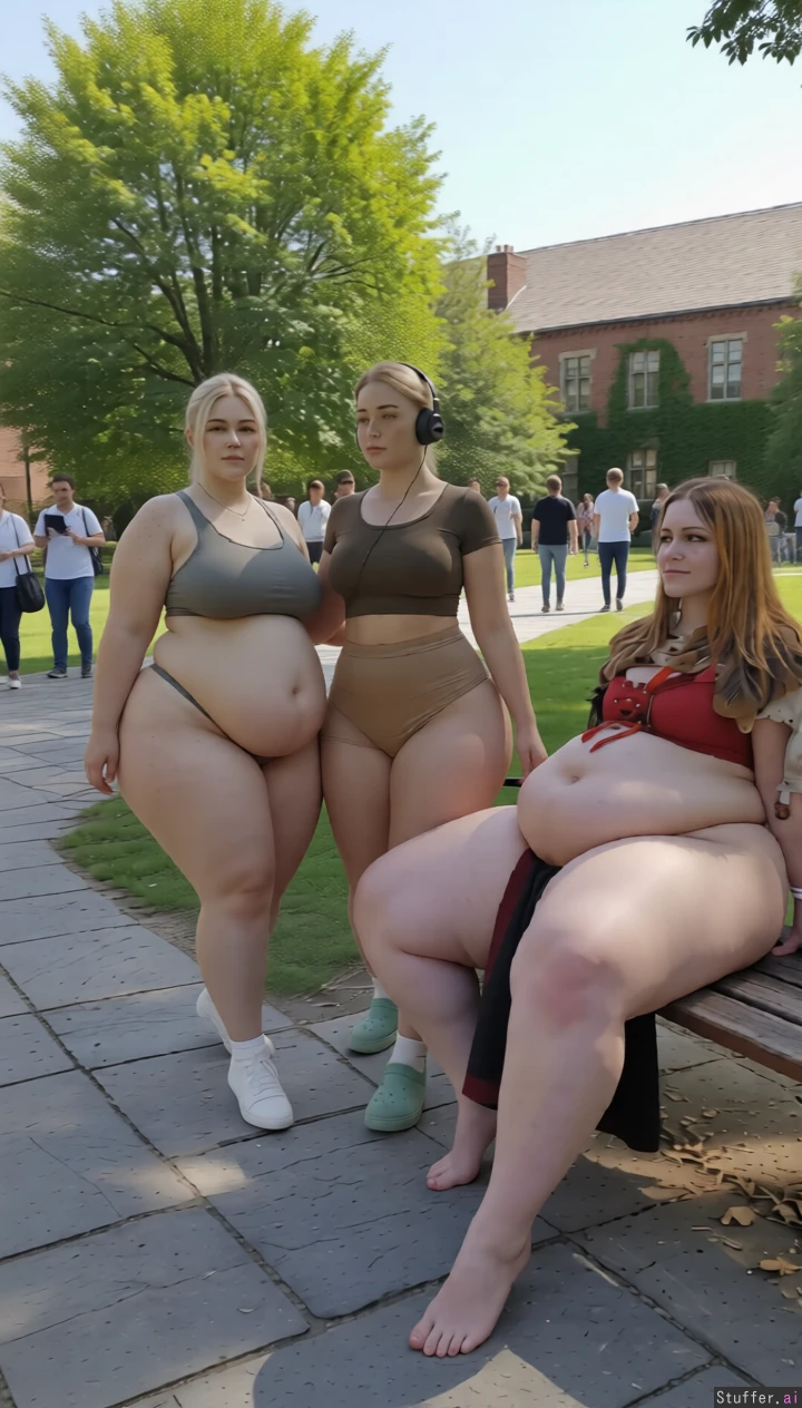 High quality, masterpiece, realistic lighting, high detail, really pretty faces, extremely fatter and fatter, they jiggle a bit, they swiftly walks by on a busy campus, keep her entire body in frame, extreme saddlebag hips, full body view, camera pulls away, huge belly getting bigger