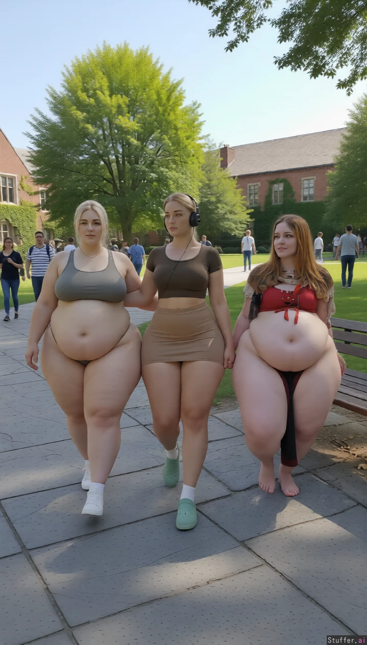 High quality, masterpiece, realistic lighting, high detail, really pretty faces, extremely fatter and fatter, they jiggle a bit, they swiftly walks by on a busy campus, keep her entire body in frame, extreme saddlebag hips, full body view, camera pulls away, huge belly getting bigger