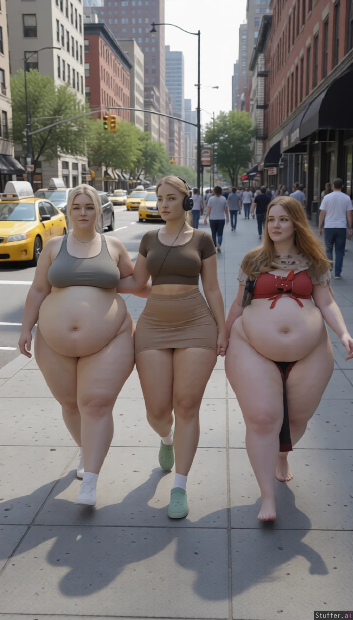 High quality, masterpiece, realistic lighting, high detail, really pretty faces, extremely fatter and fatter, they jiggle a bit, they walk on busy street, extreme saddlebag hips, extreme wide angle view, huge wide Bellies, massive fat arms, massive breasts under clothes