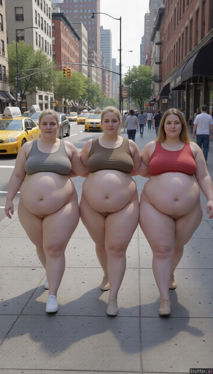 High quality, masterpiece, realistic lighting, high detail, really pretty faces, extremely fatter and fatter, they jiggle a bit, they come closer on busy street, extreme saddlebag hips, extreme wide angle view, huge wide Bellies, massive fat arms, massive breasts under clothes, facing to the camera