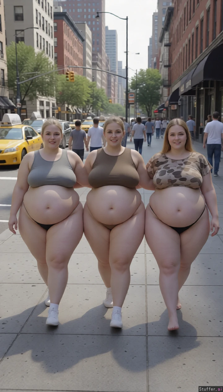 High quality, masterpiece, realistic lighting, high detail, really pretty faces, extremely fatter and fatter, they jiggle a bit, they come closer on busy street, extreme saddlebag hips, extreme wide angle view, huge wide Bellies, massive fat arms, massive breasts under clothes, facing to the camera