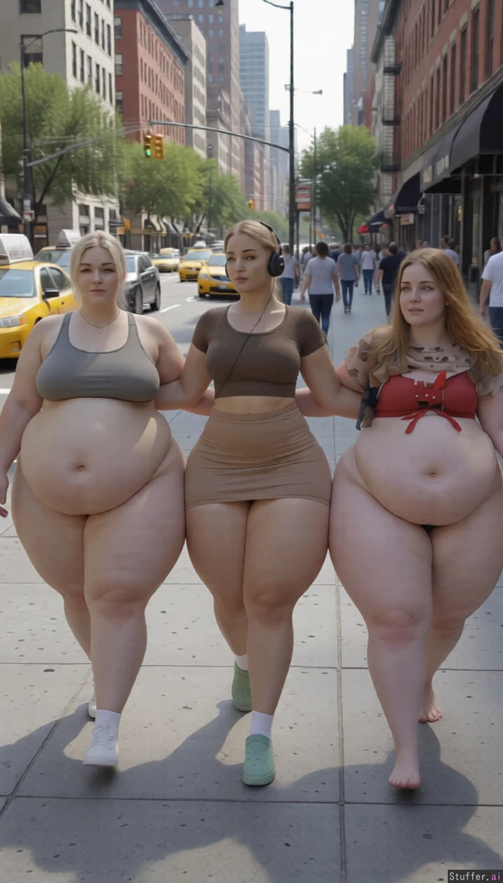 High quality, masterpiece, realistic lighting, high detail, really pretty faces, extremely fatter and fatter, they jiggle a bit, they come closer on busy street, extreme saddlebag hips, extreme wide angle view, huge wide Bellies, massive fat arms, massive breasts under clothes, facing to the camera
