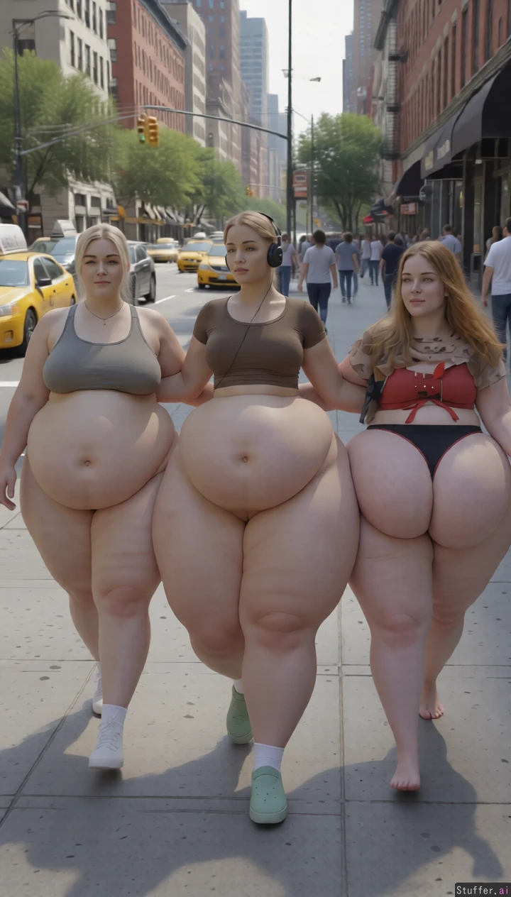 High quality, masterpiece, realistic lighting, high detail, really pretty faces, extremely fatter and fatter, they jiggle a bit, they come closer on busy street, extreme saddlebag hips, extreme wide angle view, huge wide Bellies, massive fat arms, massive breasts under clothes, facing to the camera