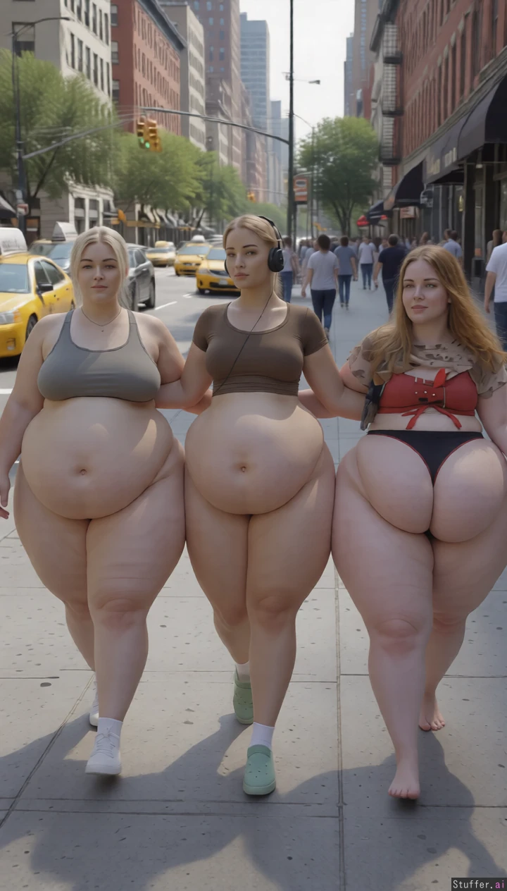 High quality, masterpiece, realistic lighting, high detail, really pretty faces, extremely fatter and fatter, they jiggle a bit, they come closer on busy street, extreme saddlebag hips, extreme wide angle view, huge wide Bellies, massive fat arms, massive breasts under clothes, facing to the camera