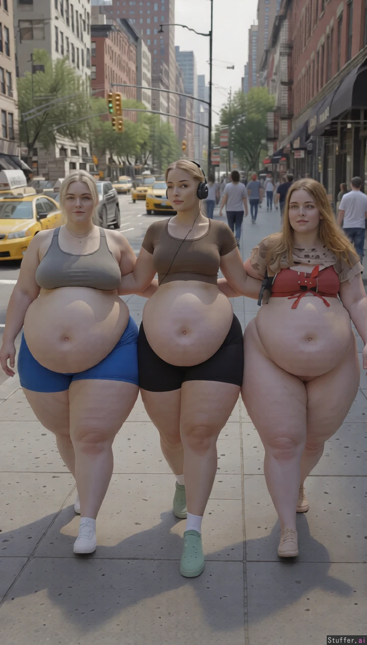 High quality, masterpiece, realistic lighting, high detail, really pretty faces, extremely fatter and fatter, they jiggle a bit, they come closer on busy street, extreme saddlebag hips, extreme wide angle view, huge wide Bellies, massive fat arms, massive breasts under clothes, tight shorts