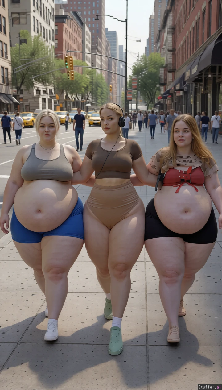 High quality, masterpiece, realistic lighting, high detail, really pretty faces, extremely fatter and fatter, they jiggle a bit, they walk on busy square in milano, extremely wide saddlebag hips, extreme wide angle view, huge wide Bellies, massive fat arms, massive breasts under clothes, tight shorts