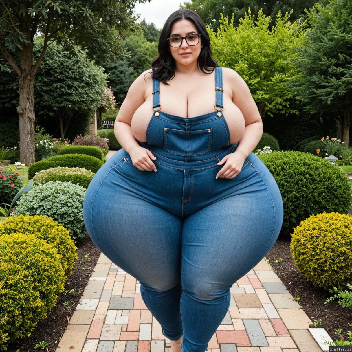 (thiccc woman with black hair, glasses walking in garden), (nude, blue jean overalls:1.2), (((extremely thiccc:1.7))), slim waist, (gigantic wide hips:2.3), (((small boobs))), (thin waist)