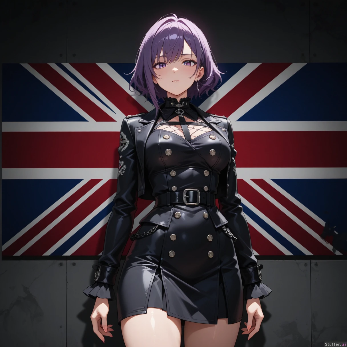 beautiful shading, highly detailed, best quality, perfect anatomy, perfect proportions, perfect lighting, (best quality), (high rating), absurd res, high res, detailed, ultra quality, ((high quality)), masterpiece, (ultra high resolution), anime style, stunning beauty, detailed face, intricate detail, sophisticated detail, 1girl, exquisite detail, absurd resolution, correct anatomy, 8k, (highly detailed face), highly detailed skin texture, short_purple_hair, purple_eyes, black_chocker, black_jacket, long_frilly_pink_dress, union_jack, whining, (obese:0.5)