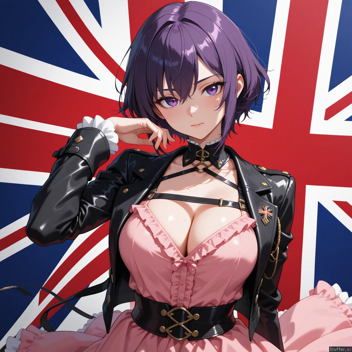 beautiful shading, highly detailed, best quality, perfect anatomy, perfect proportions, perfect lighting, (best quality), (high rating), absurd res, high res, detailed, ultra quality, ((high quality)), masterpiece, (ultra high resolution), anime style, stunning beauty, detailed face, intricate detail, sophisticated detail, 1girl, exquisite detail, absurd resolution, correct anatomy, 8k, (highly detailed face), highly detailed skin texture, short_purple_hair, purple_eyes, black_chocker, black_jacket, long frilly pink dress, union_jack, , (obese:0.5)