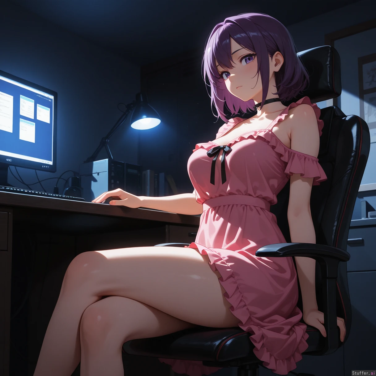 beautiful shading, highly detailed, best quality, perfect anatomy, perfect proportions, perfect lighting, (best quality), (high rating), absurd res, high res, detailed, ultra quality, ((high quality)), masterpiece, (ultra high resolution), anime style, stunning beauty, detailed face, intricate detail, sophisticated detail, 1girl, exquisite detail, absurd resolution, correct anatomy, 8k, (highly detailed face), highly detailed skin texture, short purple hair, purple eyes, black chocker, black acket, long frilly pink dress, dark bedroom, sitting behind desk, on computer, (obese:0.5)