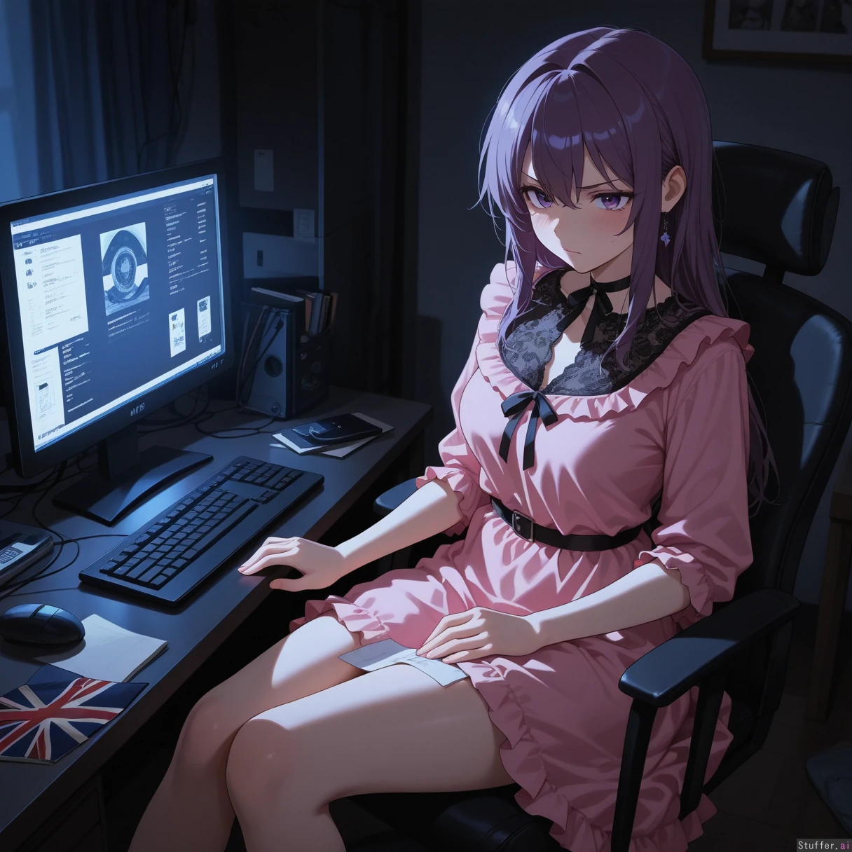 beautiful shading, highly detailed, best quality, perfect anatomy, perfect proportions, perfect lighting, (best quality), (high rating), absurd res, high res, detailed, ultra quality, ((high quality)), masterpiece, (ultra high resolution), anime style, stunning beauty, detailed face, intricate detail, sophisticated detail, 1girl, exquisite detail, absurd resolution, correct anatomy, 8k, (highly detailed face), highly detailed skin texture, short purple hair, purple eyes, black chocker, black acket, long frilly pink dress, dark bedroom, sitting behind desk, writing on computer, union jack, angry, (obese:0.5)