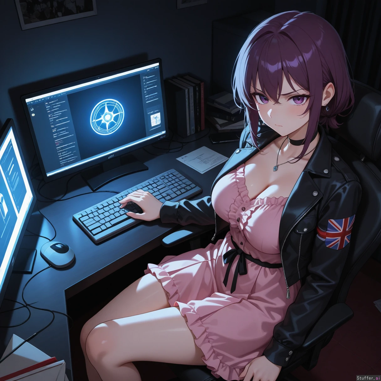 beautiful shading, highly detailed, best quality, perfect anatomy, perfect proportions, perfect lighting, (best quality), (high rating), absurd res, high res, detailed, ultra quality, ((high quality)), masterpiece, (ultra high resolution), anime style, stunning beauty, detailed face, intricate detail, sophisticated detail, 1girl, exquisite detail, absurd resolution, correct anatomy, 8k, (highly detailed face), highly detailed skin texture, short purple hair, purple eyes, black chocker, black jacket, long frilly pink dress, dark bedroom, sitting behind desk, writing on computer, union jack, angry, (obese:0.5)