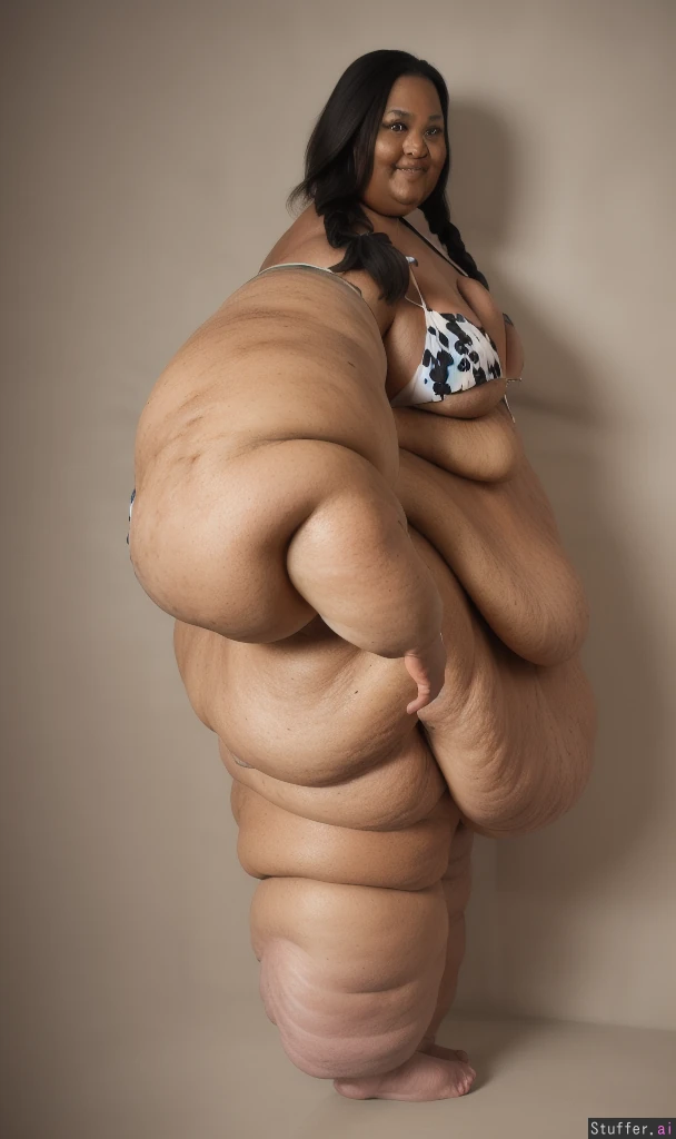 Photo realistic, highly detailed, realistic lighting, african ssbbw, standing, beautiful face:1.4, (ultra double chin:1.8), (ultra fat face:1.8), black braided hair:1.4, (wearing a black bikini:1.4), (ultra huge arms:1.9), (ultra huge legs:1.9), (ultra leg rolls:1.7), (ultra huge calves:1.8), (small breasts:1.4), (cellulite:1.5), ultra fat ankles:1.8), bare feet:1.4, (small breasts:1.4)