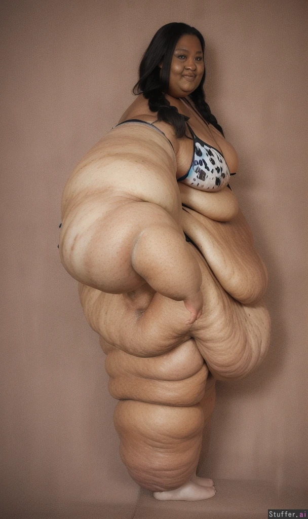 Photo realistic, highly detailed, realistic lighting, african ssbbw, standing, beautiful face:1.4, (ultra double chin:1.8), (ultra fat face:1.8), black braided hair:1.4, (wearing a black bikini:1.4), (ultra huge arms:1.9), (ultra huge legs:1.9), (ultra leg rolls:1.7), (ultra huge calves:1.8), (small breasts:1.4), (cellulite:1.5), ultra fat ankles:1.8), bare feet:1.4, (small breasts:1.4)