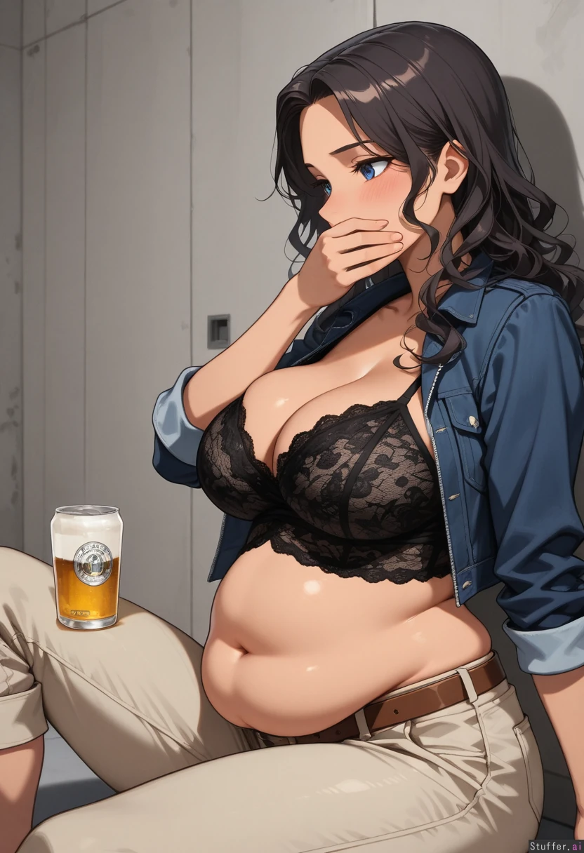 Highly detailed, cold colors, ((Mexican woman, curvy, blue eyes, black long wavy hair, tan)) ((Hazy eyes, blushing, hand covering mouth)) ((Wearing dark blue jean jacket, black lace top, high waisted khaki skinny pants capri, brown belt)), belt broken, unzipped, ((Fat belly:1.2)), side view, beer in hand, arched back, sitting, cleavage, big breasts Pants undone