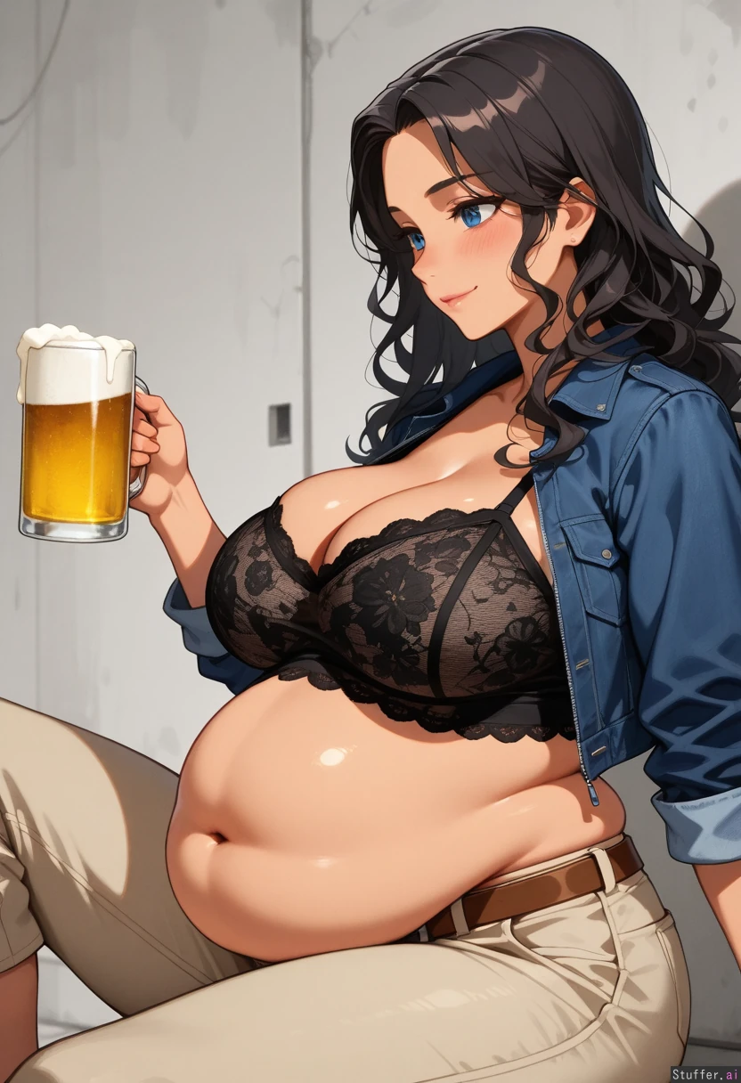 Highly detailed, cold colors, ((Mexican woman, curvy, blue eyes, black long wavy hair, tan)) ((Hazy eyes, blushing)) ((Wearing dark blue jean jacket, black lace top, high waisted khaki skinny pants capri, brown belt)), belt broken, unzipped, ((Fat belly:1.46)), side view, beer in hand, arched back, sitting, cleavage, big breasts Pants undone, looking at you, smile