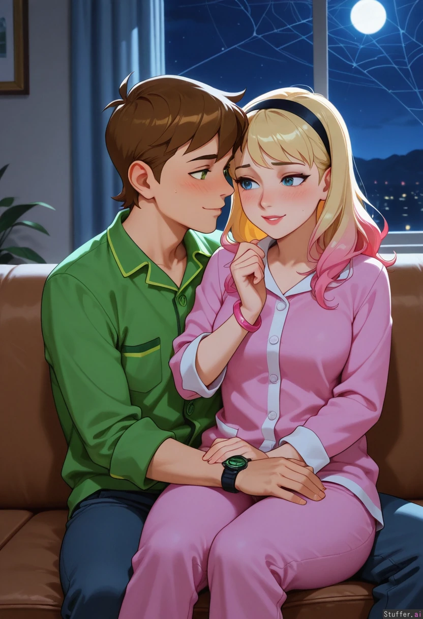 1boy, 1girl, Ben Tennyson with his green Omnitrix watch on his left wrist, Gwen Stacy with pink bracelet on her wrist, (Ben Tennyson), gwen_stacy, blonde girl with lipstick and blue eyes and two-tone multicolored pink long hair with bangs, blonde_female, black_hairband, long_hair, blonde_hair, two-tone_hair, bangs, multicolored_hair, pink_hair, blue_eyes, lipstick, spider_web, bracelet, female_with_bracelet, female no wristwatch, female_wearing_bracelet, bracelet_female, boy with green eyes and Brown short hair, short_hair, brown_hair, green_eyes, omnitrix, wristwatch, male_with_wristwatch, male no bracelet, male_wearing_wristwatch, wristwatch_male, female, male, Superhero, Superheroine, beautiful_girl, handsome_boy, babe, couple, hot couple, hot body, pretty face, both are 20-years-old, same age, same size, mature_female, mature_male, mature, mature_couple, night, smiling, smile, happy, enjoying, passionate, pleasure, sexy, looking_at_partner, eye_contact, looking_at_each_other, open_eyes, love, feeling, feeling_good, couch, pajamas, night Man: Girl: skinny, (chubby:1.01), (girl is embarrassed), (girl is looking_down)