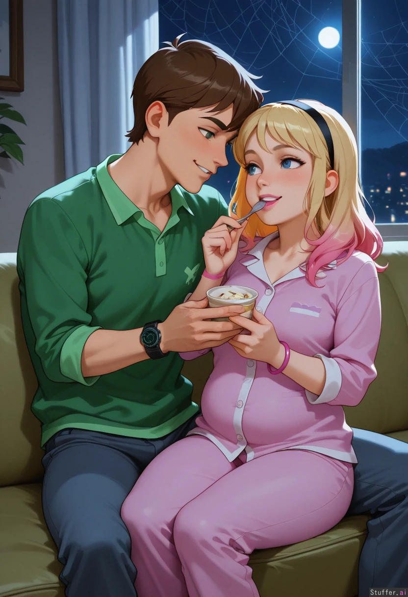 1boy, 1girl, Ben Tennyson with his green Omnitrix watch on his left wrist, Gwen Stacy with pink bracelet on her wrist, (Ben Tennyson), gwen_stacy, blonde girl with lipstick and blue eyes and two-tone multicolored pink long hair with bangs, blonde_female, black_hairband, long_hair, blonde_hair, two-tone_hair, bangs, multicolored_hair, pink_hair, blue_eyes, lipstick, spider_web, bracelet, female_with_bracelet, female no wristwatch, female_wearing_bracelet, bracelet_female, boy with green eyes and Brown short hair, short_hair, brown_hair, green_eyes, omnitrix, wristwatch, male_with_wristwatch, male no bracelet, male_wearing_wristwatch, wristwatch_male, female, male, Superhero, Superheroine, beautiful_girl, handsome_boy, babe, couple, hot couple, hot body, pretty face, both are 20-years-old, same age, same size, mature_female, mature_male, mature, mature_couple, night, smiling, smile, happy, enjoying, passionate, pleasure, sexy, looking_at_partner, eye_contact, looking_at_each_other, open_eyes, love, feeling, feeling_good, couch, pajamas, night Man: (hand on girl), Girl: skinny, (chubby:1.01), ice_cream_cup, (eating icecream), spoon
