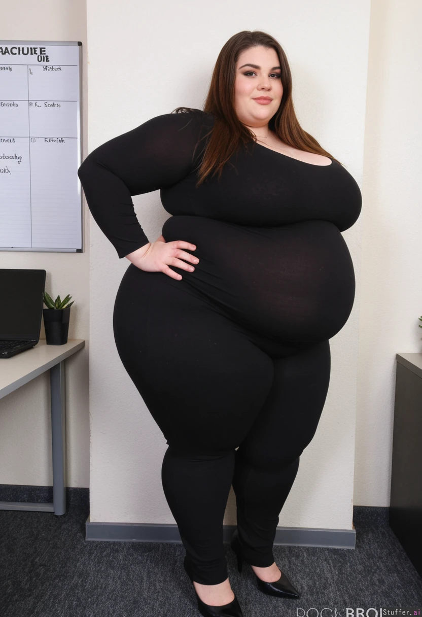 Beautiful, fat, brunette BBW with a succulent body, huge_belly:1.9, wide hips, massive belly overhang:1.8, wearing a tight black suit and black cloth pants, all dressed up, in an office