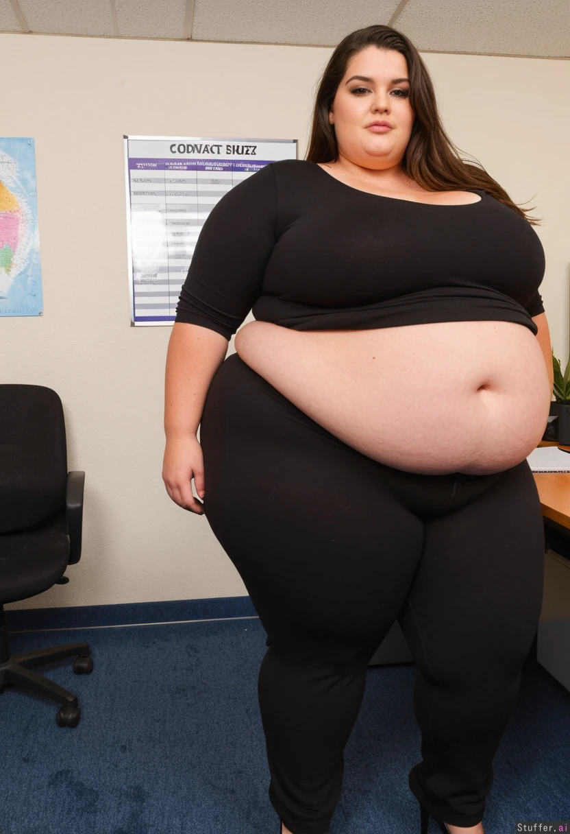 Beautiful, fat, brunette BBW with a succulent body, tanned skin, huge_belly:1.9, wide hips, massive belly overhang:1.8, wearing a tight black suit and black cloth pants, all dressed up, in an office