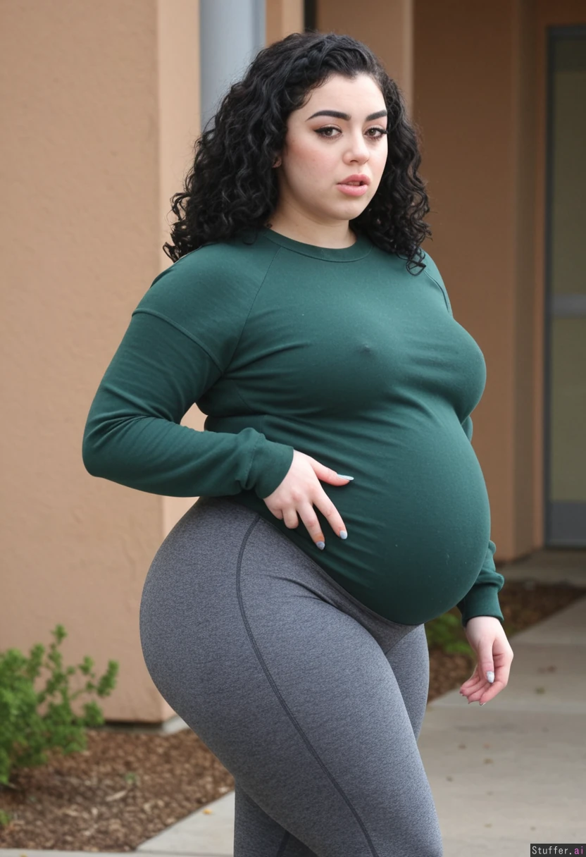 Charli xcx ,big lips, large eyes, thick eyebrows, 22 years old walking in college courtyard, out of breath, (wearing tight green sweatshirt, tight grey leggings, black curly hair)(perfect, plump pretty face) realistic (very wide hips)(very fat)( pregnant) plump thighs, plump arms, wide waist, plump stomach, cleavage, swollen pregnant belly, swollen pregnant boobs, clothes too small, clothes tight