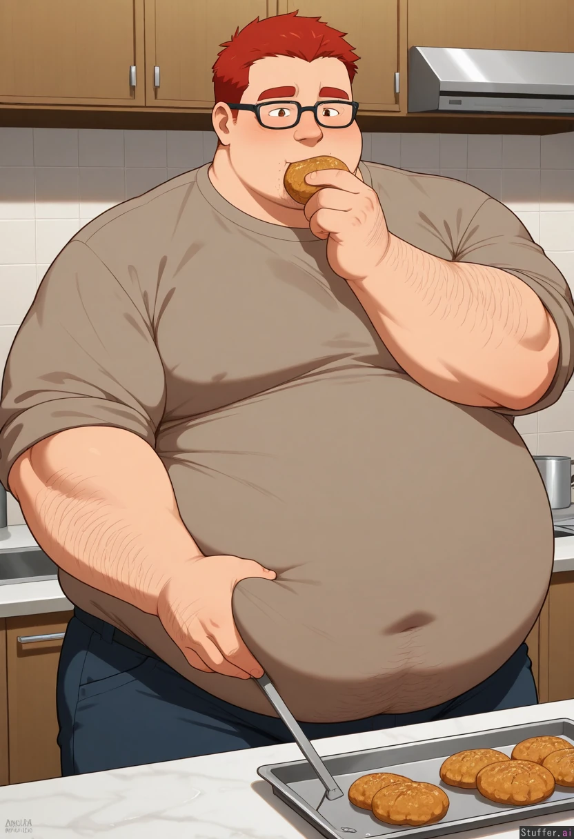 1guy, (obese), anime, (huge_belly, too fat for his clothes), hairy_belly, eating_muffin, kitchen, red_hair, glasses, belly_rub, bulging_fat, taut_clothes, ((belly_filled_to_bursting))