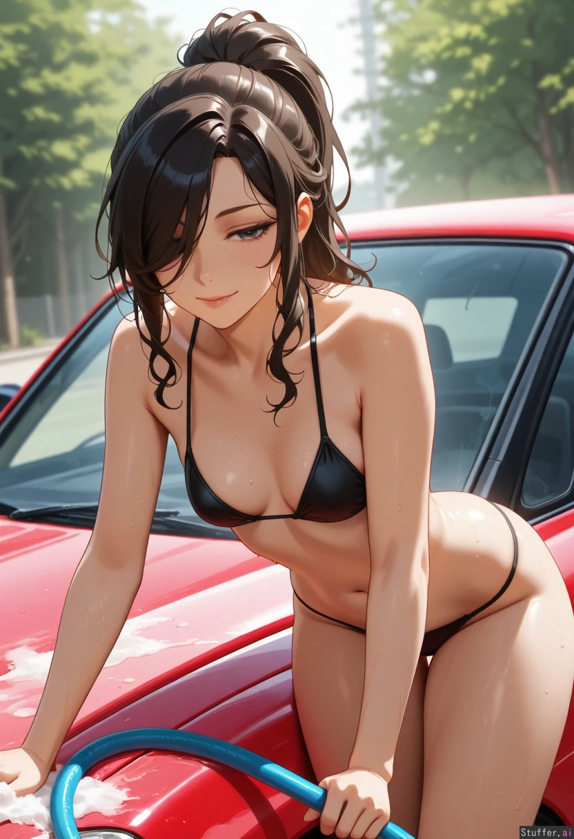(Solo), Highres, (Milf), dark hair, ponytail, layered hair, (svelte), half-closed_eyes, black bikini, hair_over_one_eye, (smile), car, leaning_forward, wet, soap_bubbles, washing, narrow hips Curvy ( Small breasts: 1.0 Medium belly: 1.0 ) Drinking from hose