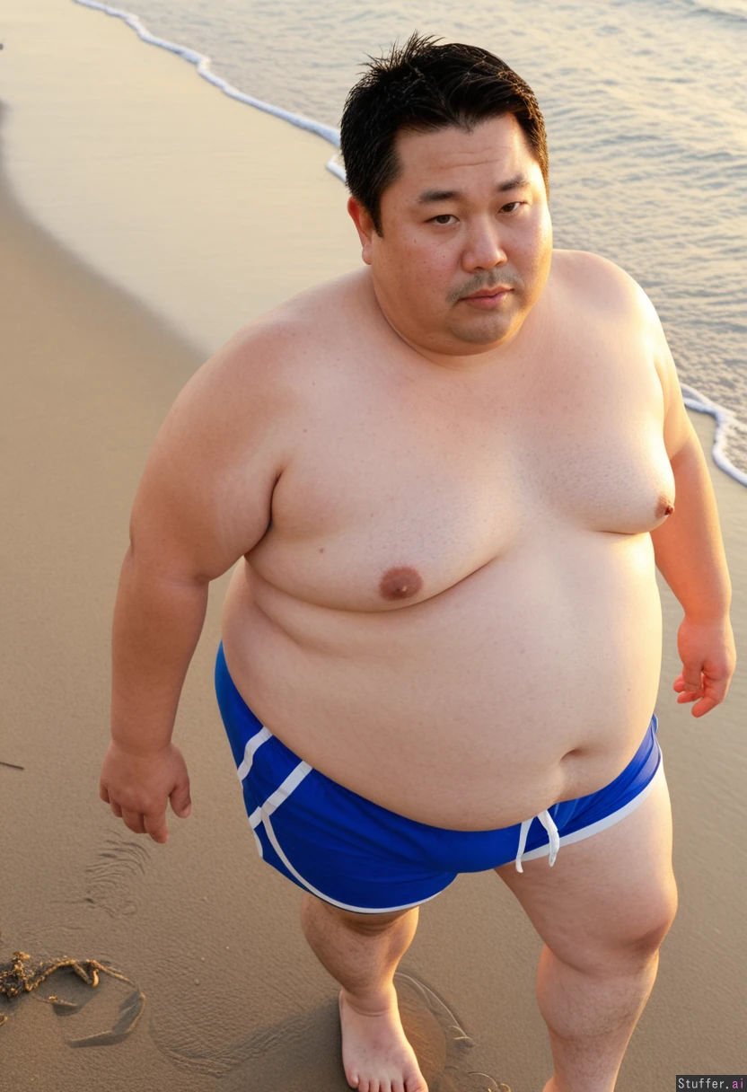 handsome japanese father/husband, walking beach at sunset. face: jaw, jawline. Black hair. pale skin with stretch marks. full body. he got fat. 45 years old Huge belly, bloated. fupa, fatpad. large Fat love handles. swim trunks Thick fat thighs. Viewed from above