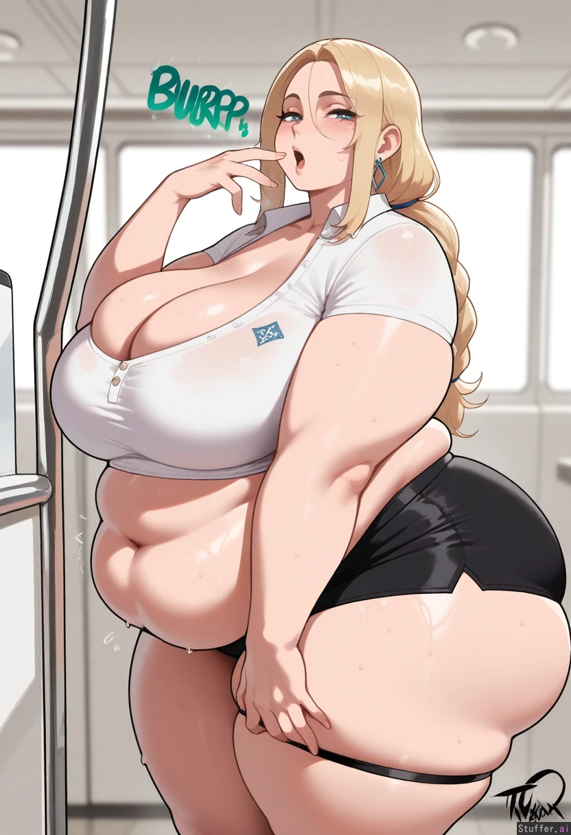 ((Solo, 1 woman)), (nyantcha(artist)), 8k, high resolution, gorgeous, masterpiece, ((flawless)), (((high rating))), ((highly detailed face)), beautiful face, ((((fat female)))), ((((thick girl)))), (((steamy))), (((skindentation))), ((())), ((())), ((((solo_female)))), (()), (((()))), ((())), ((Cleavage)), (((White polo shirt, black shorts, jewelry))), ((long straight blonde hair tied back, light blue eyes)), ((fully clothed)), (((Morbidly obese:1.5))), ((big breasts)), ((massive thighs)), ((wide hips)), fat arms, ((voluptuous)), ((huge fat ass)), sweaty, (((Sexy, seductive))), (((((burping))))), on cruise ship, flirting with viewer,