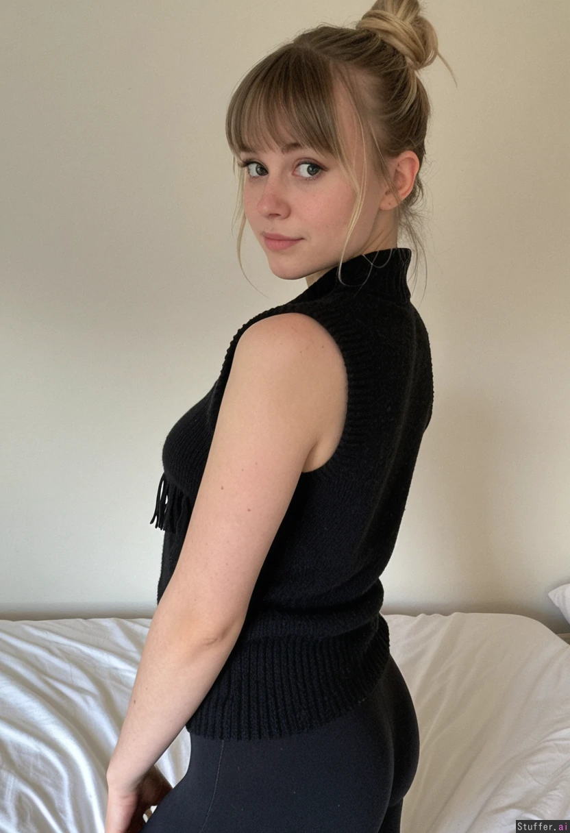 (1 girl), (20), slim, (high cheeks), pudge, (sand-colored hair), (everyday hair), (hair in a messy bun and fringe), (hair covering forehead, bangs), (conventionally pretty nose), tall, (squinty eyes), (scandinavian), (no makeup), (leftist), (smooth forehead), (no wrinkles), (back sweater vest, black leggings), medium breasts, soft light, in cafe,