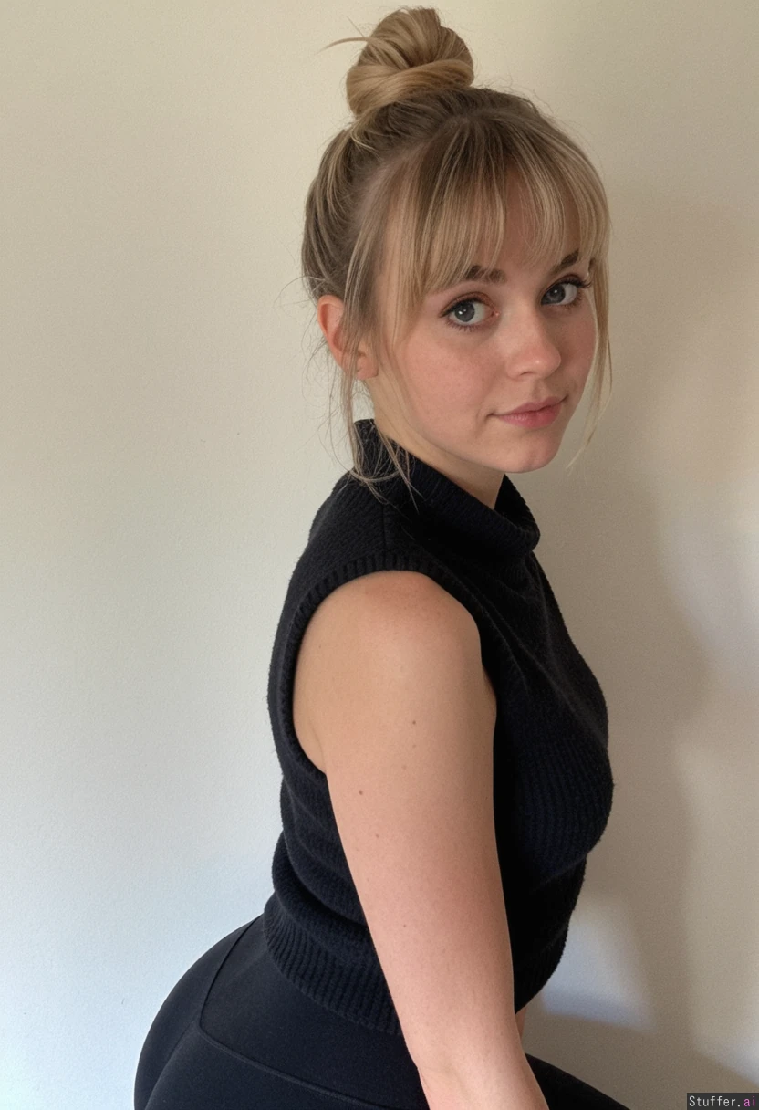 (1 girl), (20), slim, (high cheeks), pudge, (sand-colored hair), (everyday hair), (hair in a messy bun and fringe), (hair covering forehead, bangs), (conventionally pretty nose), tall, (squinty eyes), (scandinavian), (no makeup), (leftist), (smooth forehead), (no wrinkles), (back sweater vest, black leggings), medium breasts, soft light, in cafe,