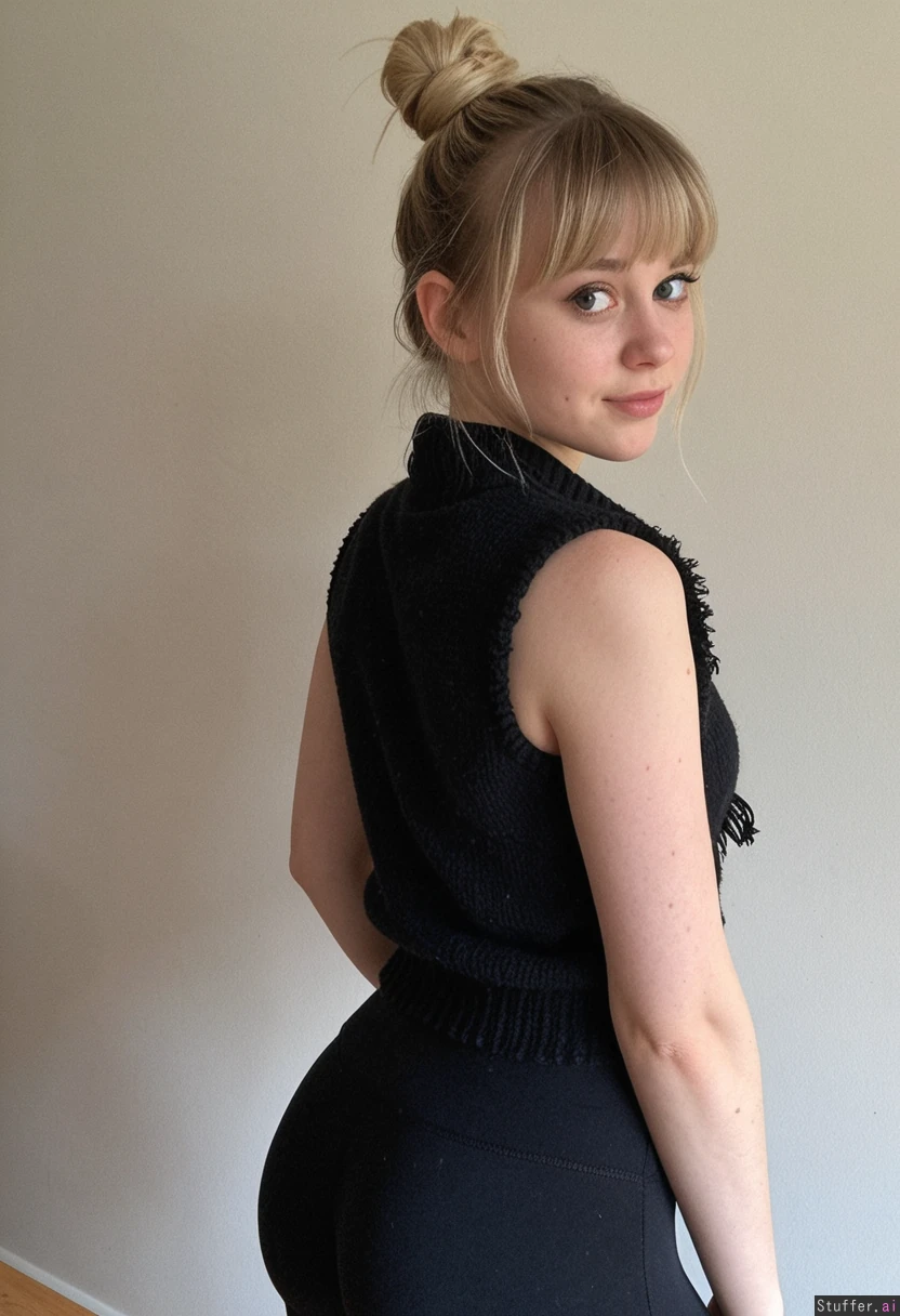 (1 girl), (20), slim, (high cheeks), pudge, (sand-colored hair), (everyday hair), (hair in a messy bun and fringe), (hair covering forehead, bangs), (conventionally pretty nose), tall, (squinty eyes), (scandinavian), (no makeup), (leftist), (smooth forehead), (no wrinkles), (back sweater vest, black leggings), medium breasts, soft light, in cafe, standing,