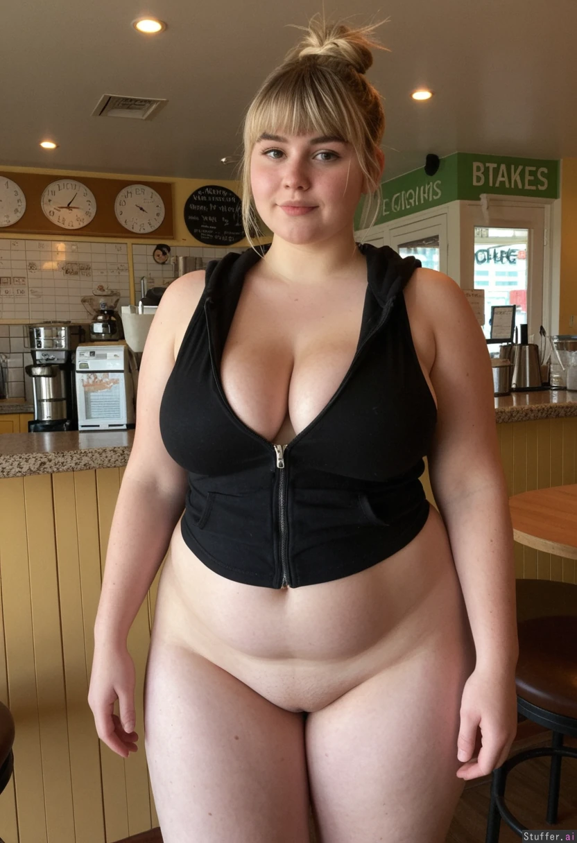 (1 girl), (20), slim, (high cheeks), pudge, (sand-colored hair), (everyday hair), (hair in a messy bun and fringe), (hair covering forehead, bangs), (conventionally pretty nose), (scandinavian), (no makeup), (leftist), soft light, in cafe, standing, cleavage, wide hips, ((thick thighs, hip dips, round thighs, big hips:1.4), (black hoodie vest:1.4), standing, (slim perfect detailed beautiful face, slight sight full body view, small shoulders, slim arms, skinny arms, slim waist, small waist:1.3), ((bloated:1.5))
