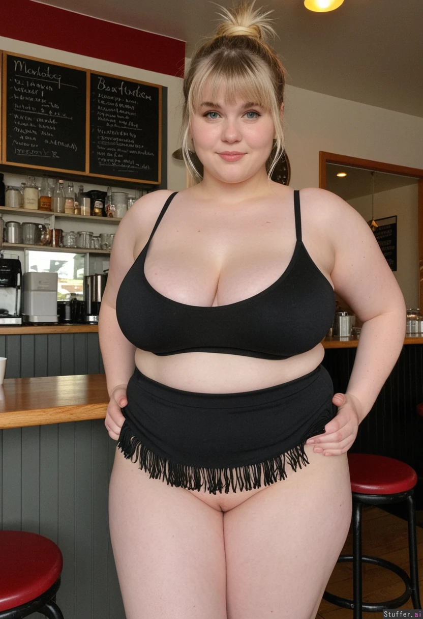 (1 girl), (20), slim, (high cheeks), pudge, (sand-colored hair), (everyday hair), (hair in a messy bun and fringe), (hair covering forehead, bangs), (conventionally pretty nose), (scandinavian), (no makeup), (leftist), soft light, in cafe, standing, large breasts, cleavage, wide hips, ((thick thighs, hip dips, round thighs, big hips:1.4), (black top with spaghetti straps:1.4), (black skirt, lace), standing, (slim perfect detailed beautiful face, slight sight full body view, wide shoulders, chubby arms, slim waist, small waist:1.3), ((bloated:1.5)),