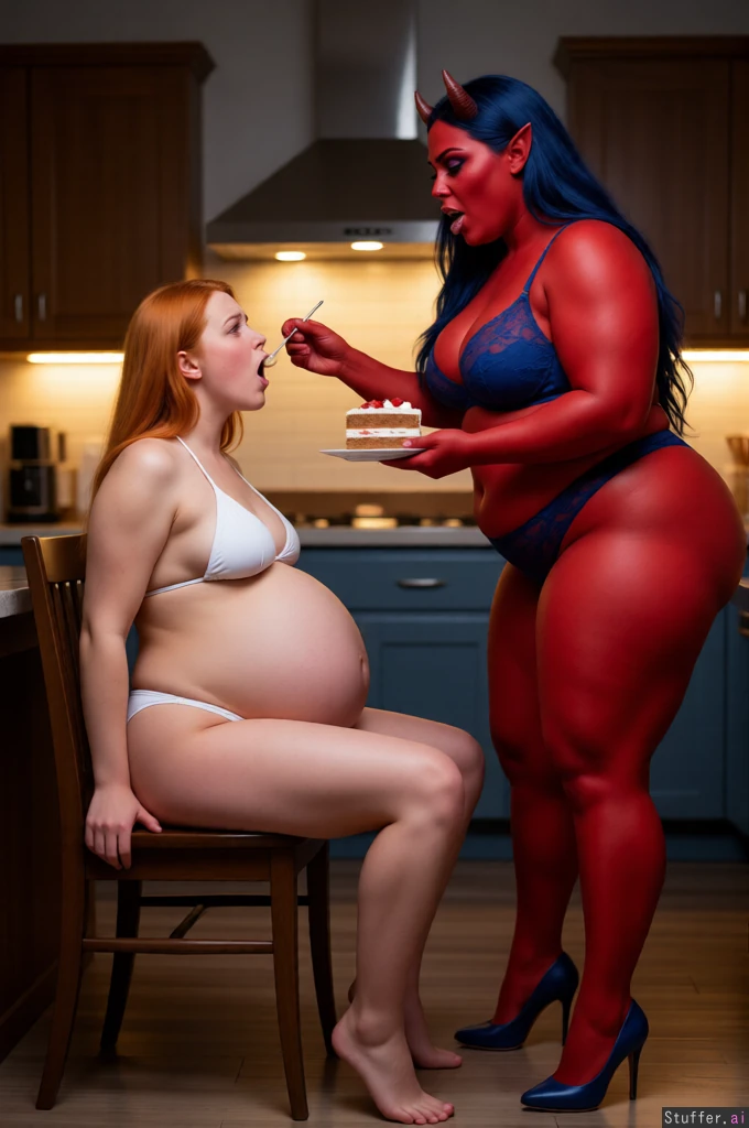 ultra photo realistic, ultra realistic evening lighting, side view, kitchen background On the left: slim ginger woman, huge and round belly, bulging cheeks, struggling face, wearing white bikini. Sitting on a chair. On the right: Obese extra curvy demon woman, red skin, heavy makeup, sexy horny face, long dark blue hair, small horns, lace dark blue bra and panties, dark blue heels, standing, holding a slice of cake, feeding ginger girl