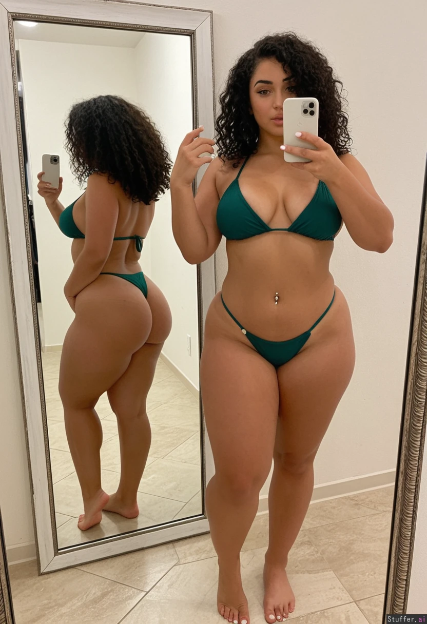 A short statured gorgeous (beautiful popular girl model face) moroccan woman in her early twenties with curly black hair wearing a dark green bikini barefoot toes painted white, Standing taking a mirror selfie. Tan She is a shortstack , pear-shaped_figure , (wide hips) (thick thighs) (bellybutton piercing) (chunky) (bottom heavy) (gained weight) Real life, realistic , best_quality She stopped working out and is getting out of shape