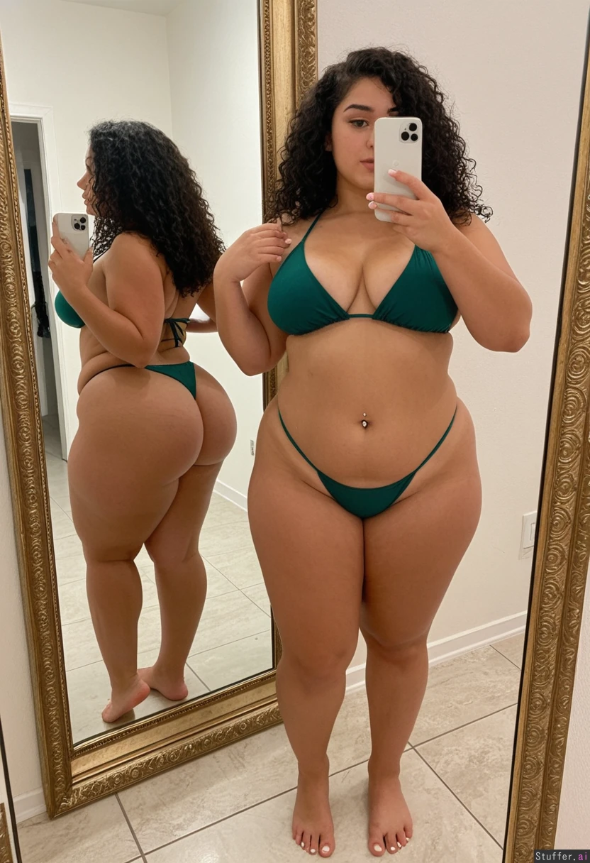A short statured gorgeous (beautiful popular girl model face) moroccan woman in her early twenties with curly black hair wearing a dark green bikini barefoot toes painted white, Standing taking a mirror selfie. Tan She is a shortstack , pear-shaped_figure , (wide hips) (thick thighs) (bellybutton piercing) (very chubby) (bottom heavy) (gained weight) Real life, realistic , best_quality She stopped working out and is getting out of shape