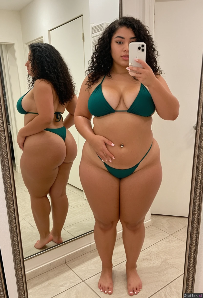 A short statured gorgeous (beautiful popular girl model face) moroccan woman in her early twenties with curly black hair wearing a dark green bikini barefoot toes painted white, Standing taking a mirror selfie. Tan She is a shortstack , pear-shaped_figure , (wide hips) (thick thighs) (bellybutton piercing) (very obese) (bottom heavy) Real life, realistic , best_quality She stopped working out and is getting out of shape