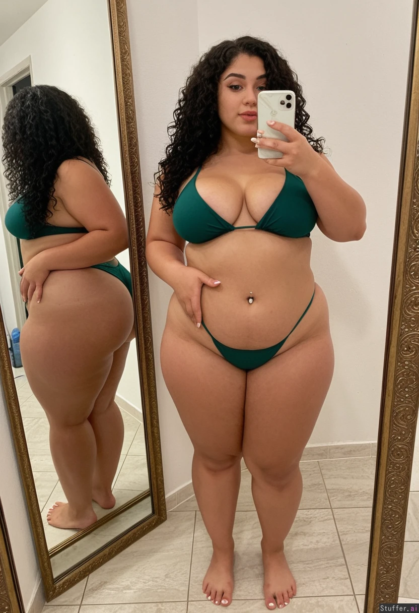 A short statured gorgeous (beautiful popular girl model face) moroccan woman in her early twenties with curly black hair wearing a dark green bikini barefoot toes painted white, Standing taking a mirror selfie. Tan She is a shortstack , pear-shaped_figure , (wide hips) (thick thighs) (bellybutton piercing) (extremely obese) (bottom heavy) (ssbbw) Real life, realistic , best_quality She stopped working out and is getting out of shape