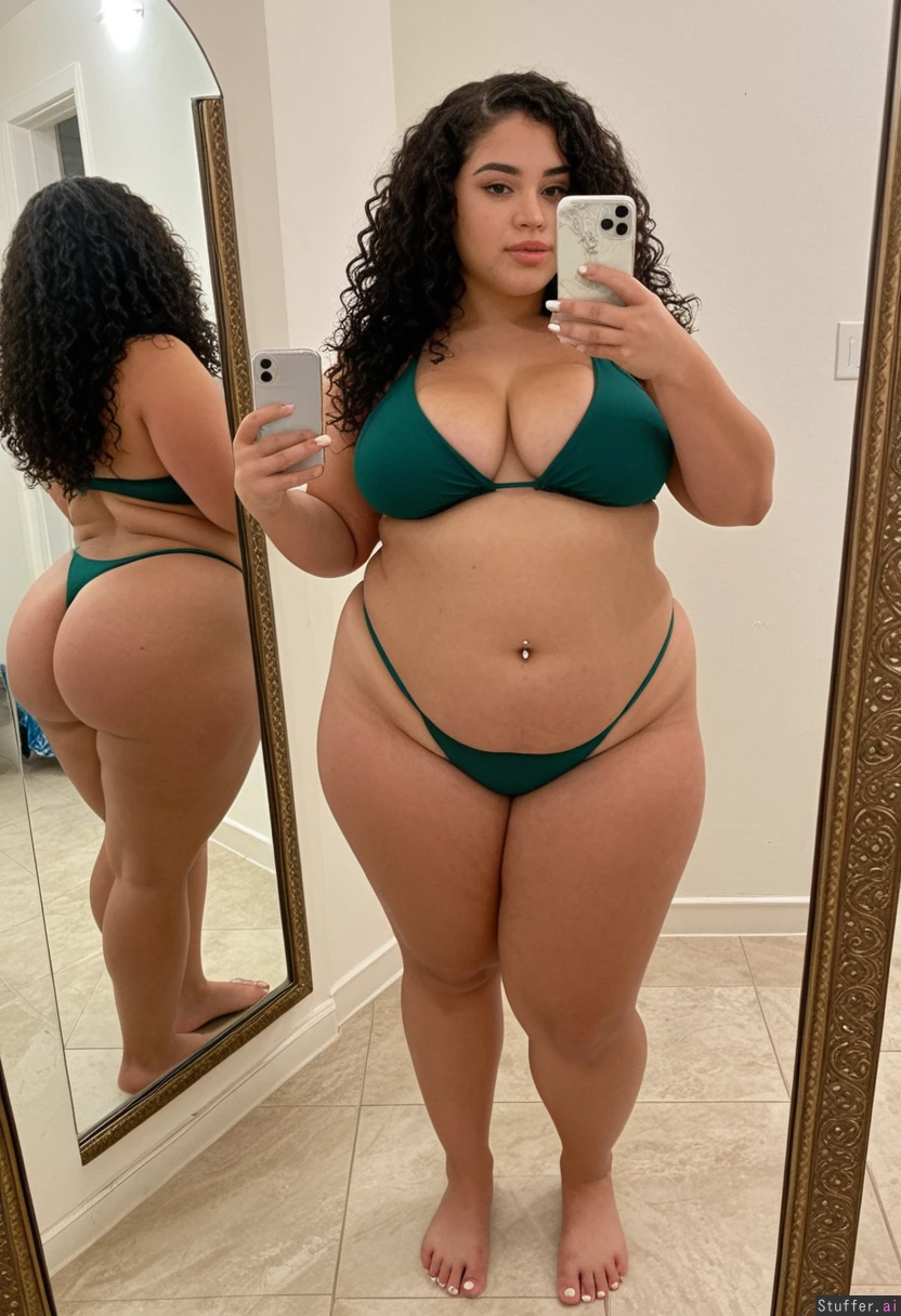 A short statured gorgeous (beautiful popular girl model face) moroccan woman in her early twenties with curly black hair wearing a dark green bikini barefoot toes painted white, Standing taking a mirror selfie. Tan She is a shortstack , pear-shaped_figure , (wide hips) (thick thighs) (bellybutton piercing) (fat belly) (extremely obese) (bottom heavy) (ssbbw) Real life, realistic , best_quality She stopped working out and is getting out of shape