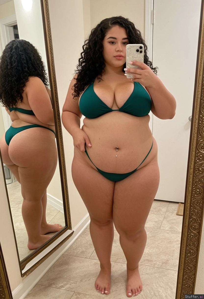 A short statured gorgeous (beautiful popular girl model face) moroccan woman in her early twenties with curly black hair wearing a dark green bikini barefoot toes painted white, Standing taking a mirror selfie. Tan She is a shortstack , pear-shaped_figure , (wide hips) (thick thighs) (bellybutton piercing) (fat belly) (extremely obese) (bottom heavy) (ssbbw) (very fat) Real life, realistic , best_quality She stopped working out and is getting out of shape