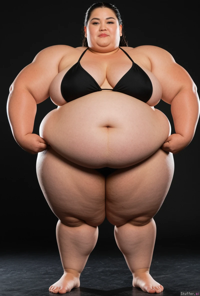 Photo realistic, highly detailed, realistic lighting, african ssbbw, standing, beautiful face:1.4, (ultra double chin:1.8), (ultra fat face:1.8), black braided hair:1.4, (wearing a black bikini:1.4), (ultra huge arms:1.9), (ultra huge legs:1.9), (ultra leg rolls:1.7), (ultra huge calves:1.8), (small breasts:1.4), (cellulite:1.5), ultra fat ankles:1.8), bare feet:1.4, (small breasts:1.4)