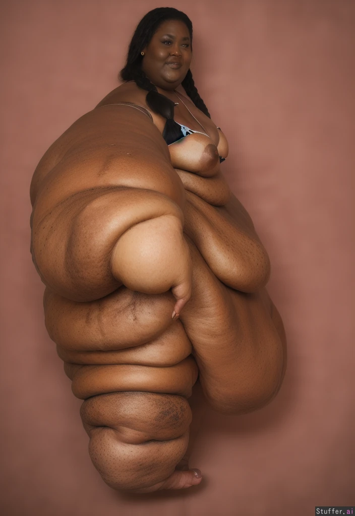 Photo realistic, highly detailed, realistic lighting, african ssbbw, standing, beautiful face:1.4, (ultra double chin:1.8), (ultra fat face:1.8), black braided hair:1.4, (wearing a black bikini:1.4), (ultra huge arms:1.9), (ultra huge legs:1.9), (ultra leg rolls:1.7), (ultra huge calves:1.8), (small breasts:1.4), (cellulite:1.5), ultra fat ankles:1.8), bare feet:1.4, (small breasts:1.4)