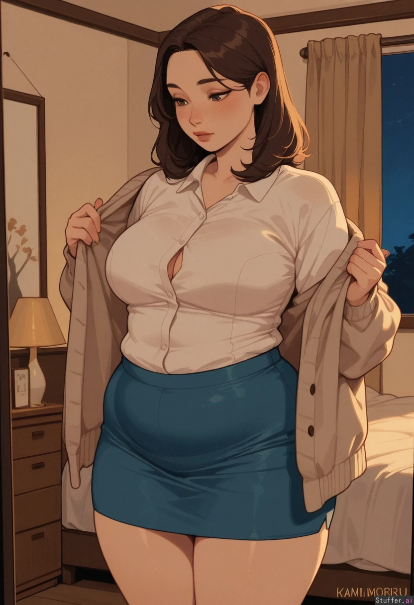 Highly detailed, morning, warm colors, KAMII MOMORU (artist), night,natural light Japanese girl, asian, medium hair, brown hair,(chubby belly,fat waist, lovehandles) Tight white buttoned shirt, blue pencil skirt, cardigan In bedroom, dressing up, standing